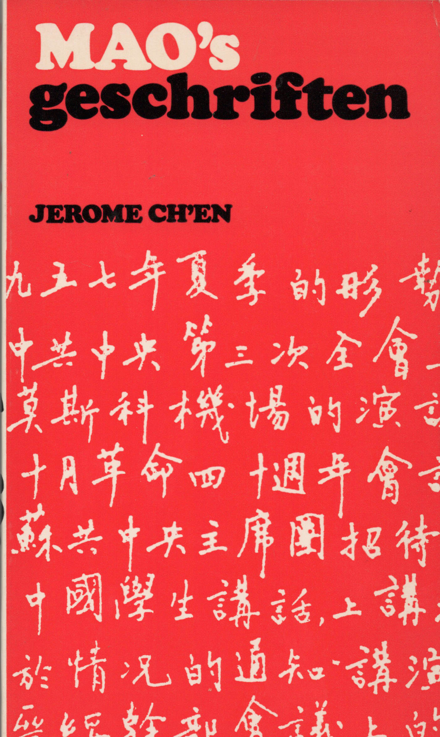 Jerome Ch’en heeft een Antal tot dusver niet gepubliceerde of minder bekende geschriften van Mao Tse-toeng vertaald en in dit boek bijeengebracht. Hierbij inbegrepen zijn Mao’s instructies die werden uitgegeven voor en tijdens de Culturele Revolutie. Deze instructies, bijeengezameld en in chronologische volgorde gezet, zijn van grote betekenis voor diegenen die de traumatische gebeurtenissen die gedurende die periode in China plaatsvonden, willen doorgronden.