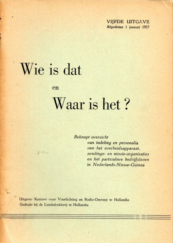 Beknopt overzicht van indeling en personalia van het overheidsapparaat, zending- en missie-organisaties en het particuliere bedrijfsleven in Nederlands Nieuw-Guinea. Vijfde uitgave 1957.
