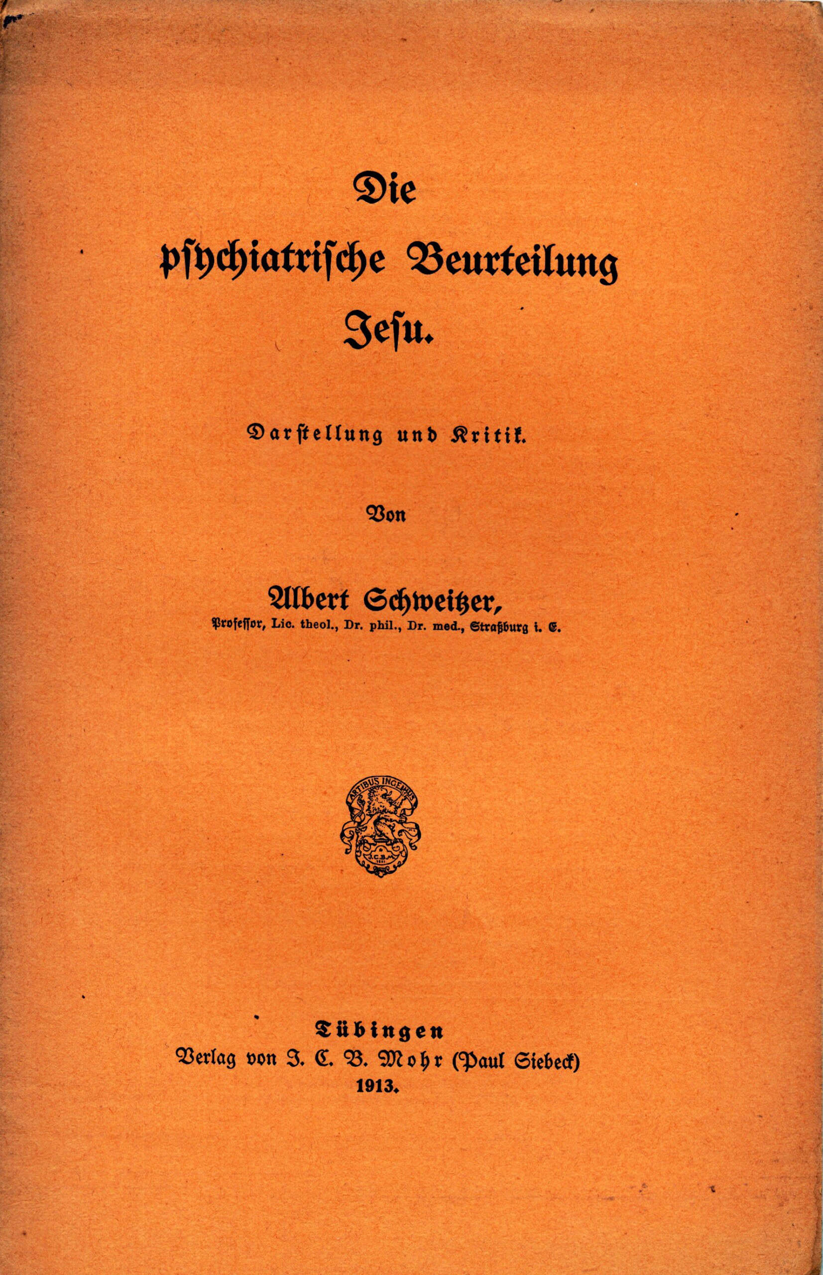 „Die psychiatrische Beurteilung Jesu“ ist die medizinische Promotionsarbeit von Albert Schweitzer, die er 1913 mit 33 Jahren vorgelegt hatte.